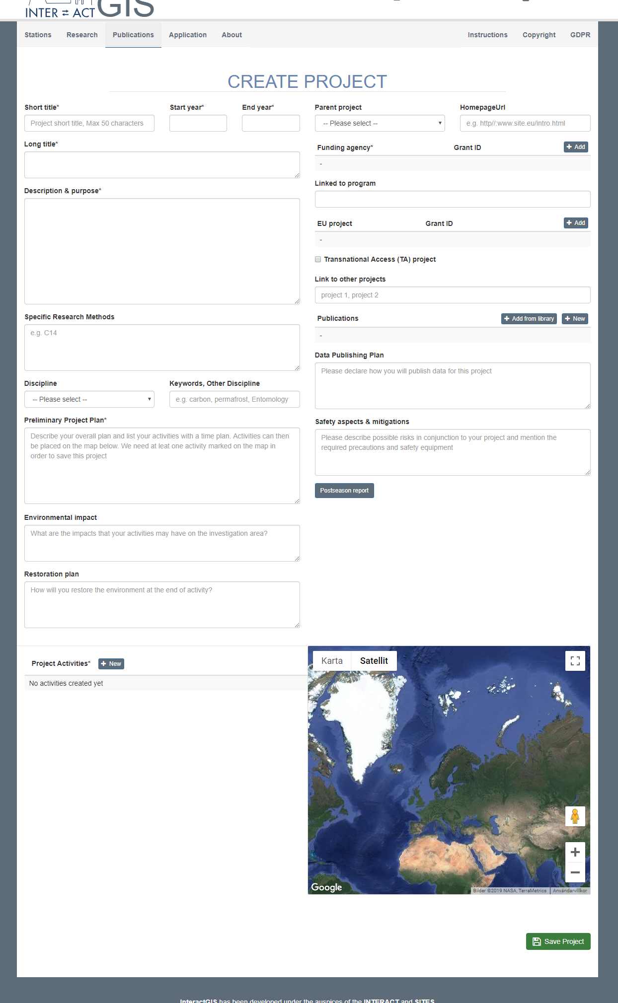 At the PI level of privilege, scholars accumulate a personal editable record of applications, activities, and collaborators across their respective networks of visited stations. In the new version of INTERACT GIS, a “project” may consist of any number of activities spread across any number of stations. The project is hence at focus, where former versions focused on “stations”. Just like stations are encouraged to embrace the administrative functionalities available at the active level of usage, PI’s are encouraged to include the maintenance of their respective INTERACT GIS records as part of everyday work.