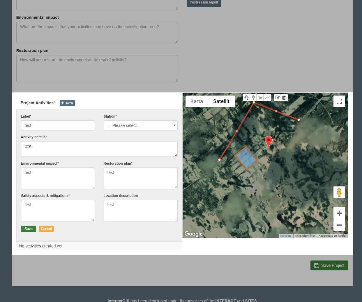 On the google map you can pinpoint where your project activities will be taken place. You can put markers, draw lines and shapes by clicking on