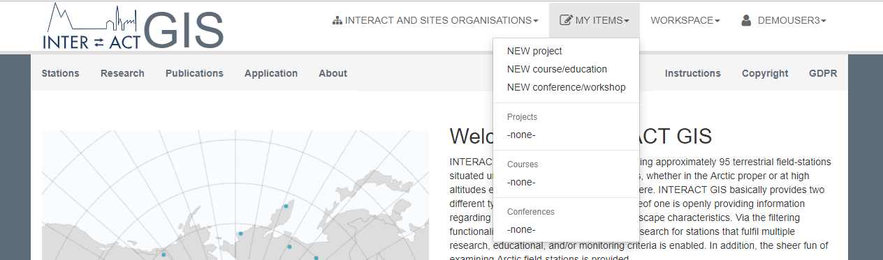 Once you have entered INTERACT GIS, it is quite self-explanatory if you only invest in taking the personal time required to learn the depths of the system. In order to enter INTERACT GIS, and to boost your understanding of what you are facing, you need to know the following: INTERACT GIS is now hosting the digital version of the INTERACT Station Catalogue, which already has been fed into the system. In addition, the Station Catalogue will be supplemented with information regarding the monitoring activities that are being performed as part of regular station activities. One new thing with INTERACT GIS (as compared with earlier versions) is that all the information mentioned above is available for edition by the stations themselves. In fact, all user field-stations are encouraged to build and maintain their respective station-records as part of their everyday work.